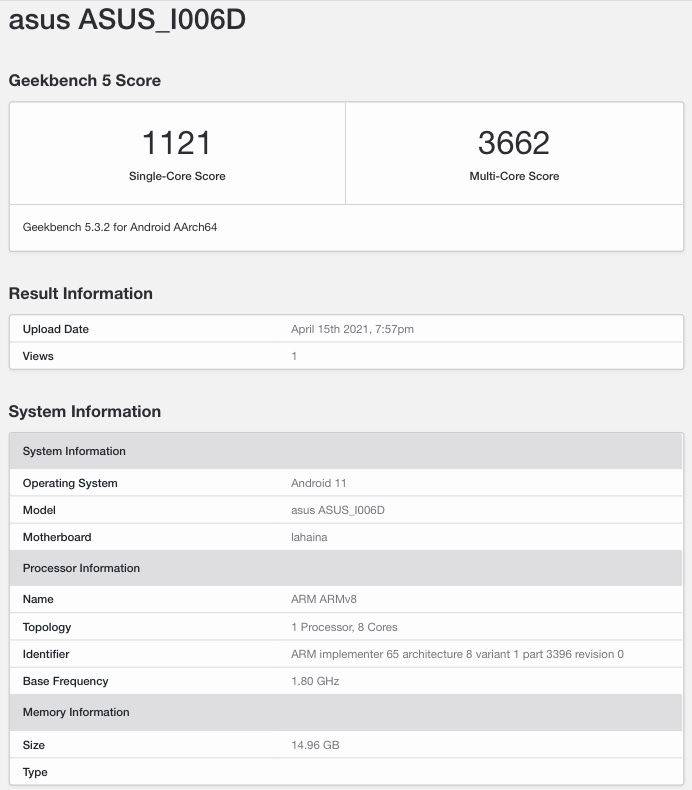 The ASUS Zenfone 8 Mini is speculated to carry the model number Asus_I006D. And this was the very model that was spotted on Geekbench today. According to the listing, the ZenFone 8 Mini has an octa-core SoC with one of the CPU cores clocked at 2.84GHz and Adreno 660 GPU. The only processor to have this CPU and GPU combination is Qualcomm’s flagship chipset, the Snapdragon 888. It means that the ASUS ZenFone 8 Mini has the Snapdragon 888 SoC.