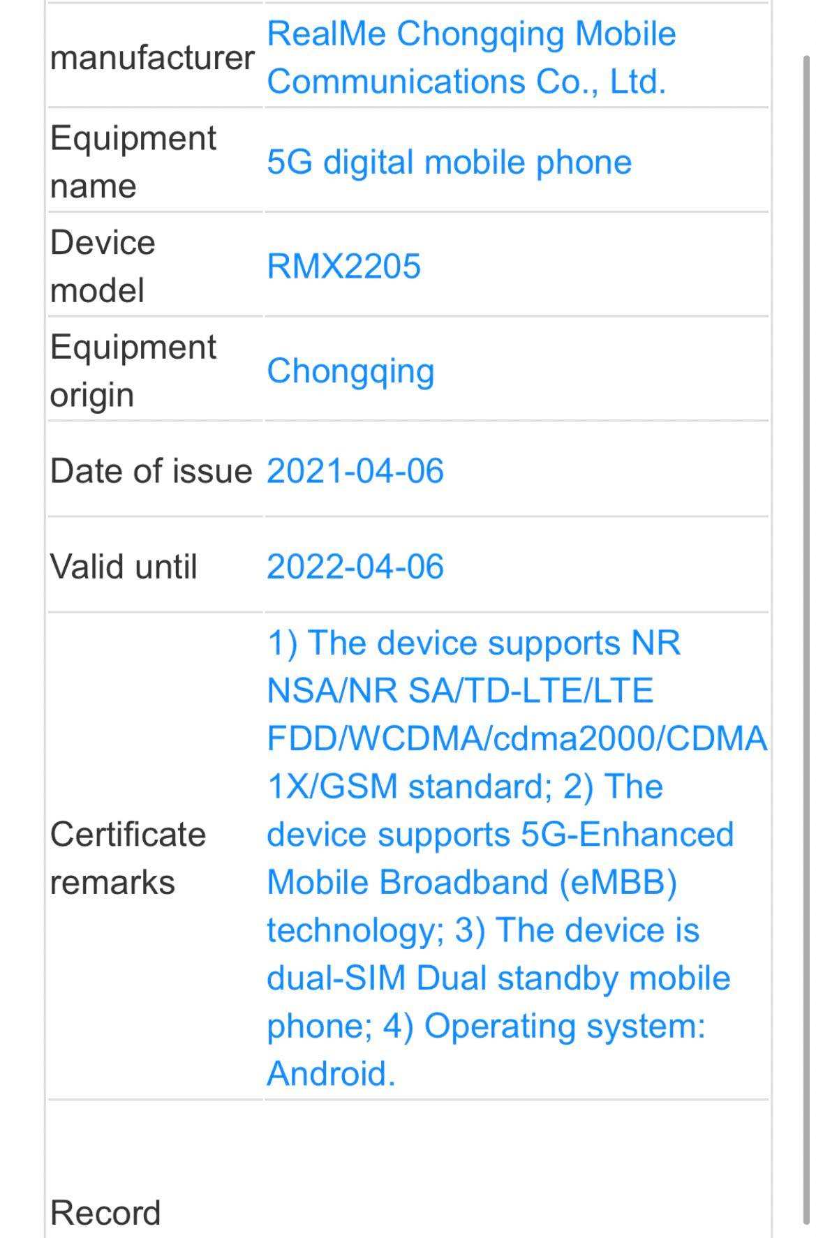 The TENAA listing reveals the Realme RMX2205 is a 5G smartphone. The phone measures 158.5 x 73.3 x 8.4 and it features a 6.43-inch display. The device packs a 4,400mAh battery and runs on Android 11. Lastly, the TENAA listing reveals the handset supports dual SIM dual standby.