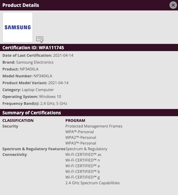 Samsung Galaxy Book Go laptop seems ready to launch alongside the Galaxy Book Pro and Galaxy Book Pro 360 on Samsung’s April 28th Galaxy Unpacked event as the laptop has now been spotted on the Wi-Fi Alliance website with model number NP340XLA. To recall, the upcoming laptop’s specifications were leaked in February this year and is expected to be an ARM-based Windows 10 laptop from Samsung. While the Wi-Fi Alliance listing only reveals that the laptop will operate within 2.4GHz and 5GHz frequency bands and run Windows 10, the previous leak revealed that the upcoming portable from Samsung will be powered by a Qualcomm Snapdragon 7c/8cx processor.