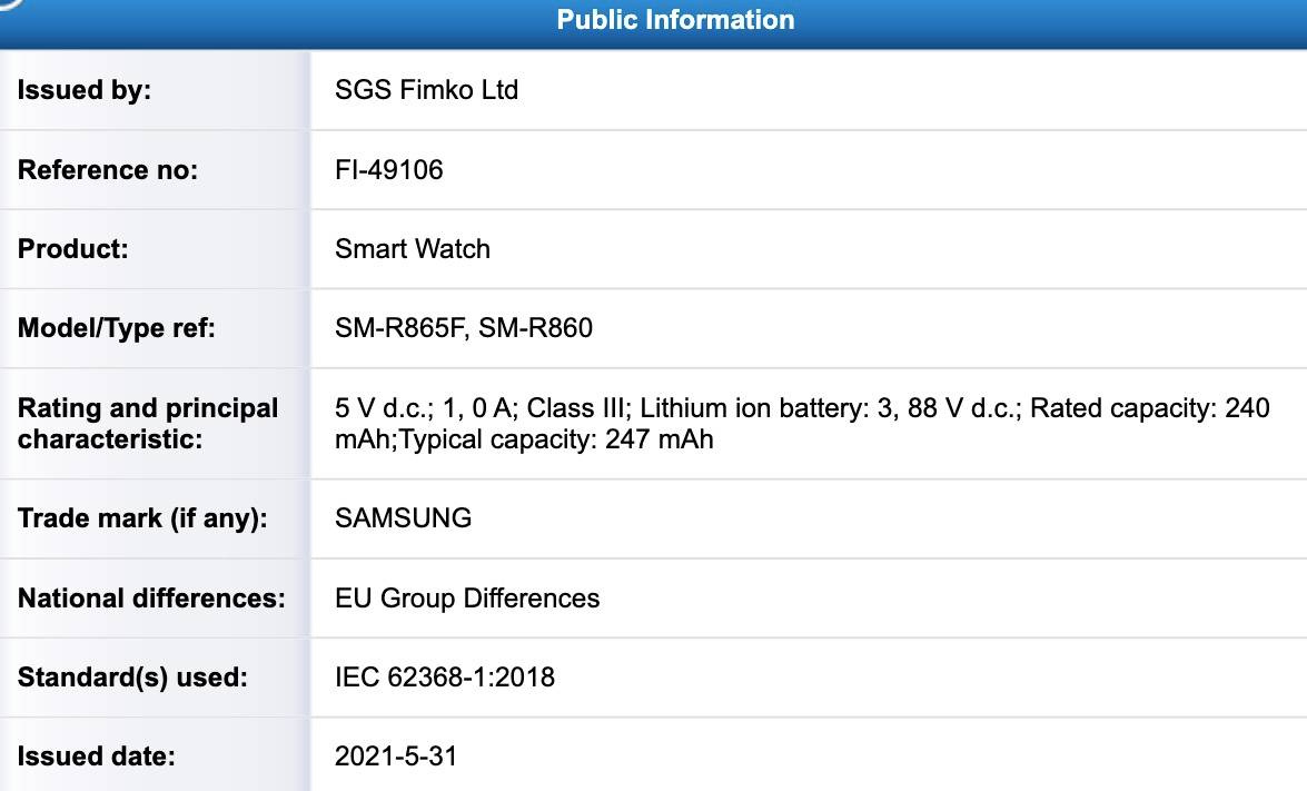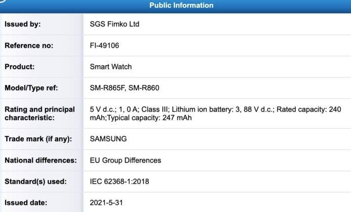 The SGS Fimko listing reveals the Samsung Galaxy Watch 4 model numbers SM-R865F and SM-R860, which are the same model numbers that appeared on the Wi-Fi Alliance listing last month. This means we’re looking at the Samsung Galaxy Watch 4 and the Fimko listing reveals that the smartwatch will pack a 247mAh battery. Additionally, the watch will support 5W charging.