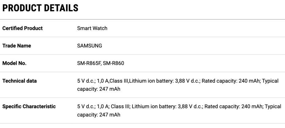 The 247mAh battery suggests that the SM-R865F and SM-R860 are the 41mm variant of the Samsung Galaxy Watch 4. To recall, the Galaxy Watch 3 41mm variant featured a 240mAh battery, while the 45mm model housed a bigger 340mAh unit. That said, the original Galaxy Watch packed a much bigger 472mAh battery and it looks like the upcoming Galaxy Watch 4 won’t offer a battery capacity that big. Still, with a new and optimised Wear OS platform that promises good battery life, it seems the Samsung Galaxy Watch 4 will do just fine on a 247mAh battery.