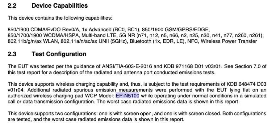 The biggest takeaway from the FCC listing is that the Samsung Galaxy Z Flip 3 supports 5G. The document reveals the phone supports n71, n12, n5, n66, n2, n25, n30, n41, n77, n78, n260, and n261 5G NR frequency bands. The device also comes with NFC support, several LTE bands, and wireless charging support, as expected. It seems the phone supports wireless charging (EP-N5100) at 9W. To recall, the 3C listing of the phone that was spotted last month revealed 15W wired charging support.