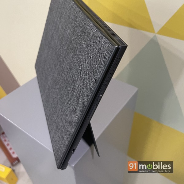 Clad in metal, the Dual 7i feels quite premium, and features a kickstand at the back that helps prop it up on a flat surface. Up front is a 13-inch touchscreen, with noticeably wide bezels. When it’s propped up on its kickstand, you’ll see the vents on top, and stereo speakers on the sides. The power key is placed on the right spine (in the same orientation), along with a volume rocker and a Thunderbolt 4 port. On the left is an audio combo jack, a microSD tray, and two USB Type-C 3.2 ports. One of these two ports is always on, while the other is used for charging, offering PD and DisplayPort support. Atop the screen, there’s a 5MP fixed focus shooter, while a 5MP autofocus camera is placed on the back.