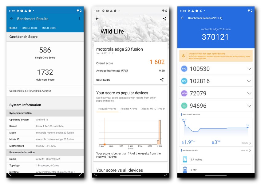 The processing on the Moto Edge 20 Fusion is handled by the Dimensity 800u 5G chipset and I have some details on its relative performance here. Basically it boils down to the fact that getting through moderate to easy tasks on your phone will never be a problem. The Edge 20 Fusion didn’t show any lag during my usage and I really put the device through its paces. Motorola’s bare-bones, stripped-down skin running over Android is basically the closest you will get to stock Android, which prevents the processor from getting too overwhelmed. With benchmark numbers such as the overall score of 370,121 on Antutu as testimony, I can say that performance will not be an issue on the Moto Edge 20 Fusion. Of course, if you are looking for better GPU capabilities, the POCO X3 Pro (review) running the Snapdragon 860 could better serve your purposes. I’m not saying that the Moto Edge 20 Fusion is not adept at heavy graphical tasks, but you do have the option to run the demanding BGMI at Extreme frame rate option of 60fps on the X3 Pro as compared to the Ultra 45 fps on the Edge 20 Fusion.
