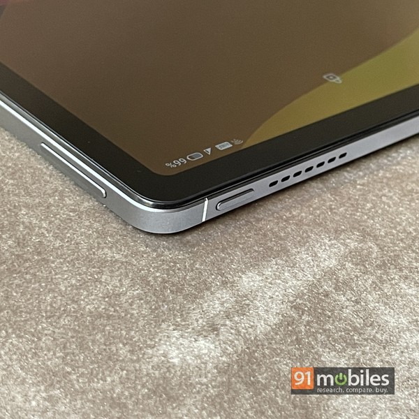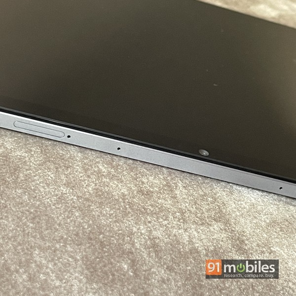 Holding the slate in landscape mode, you’ll see quad speakers on the side, with the power key placed on the left spine and the right housing the Type-C port. On top is the volume rocker, along with a pair of mics and a tray that accepts a nano-SIM and a microSD card. The 3.5mm headphone socket is tucked away into the bottom right corner… which is an odd placement since it ends up getting in the way when you have wired headphones connected and are holding the slate using both hands.