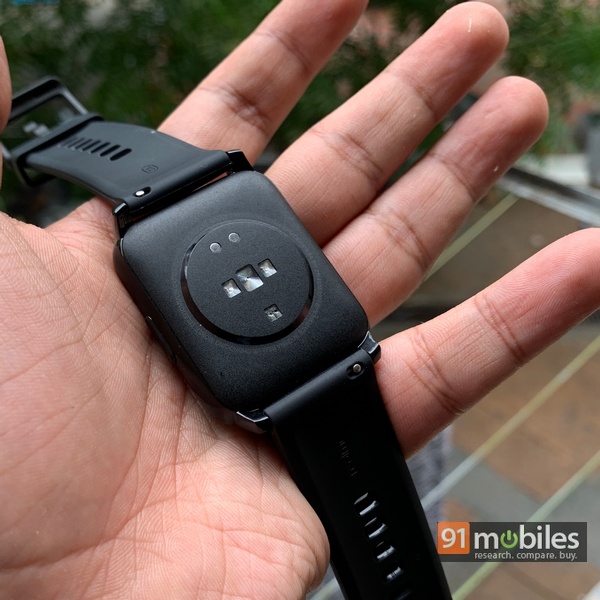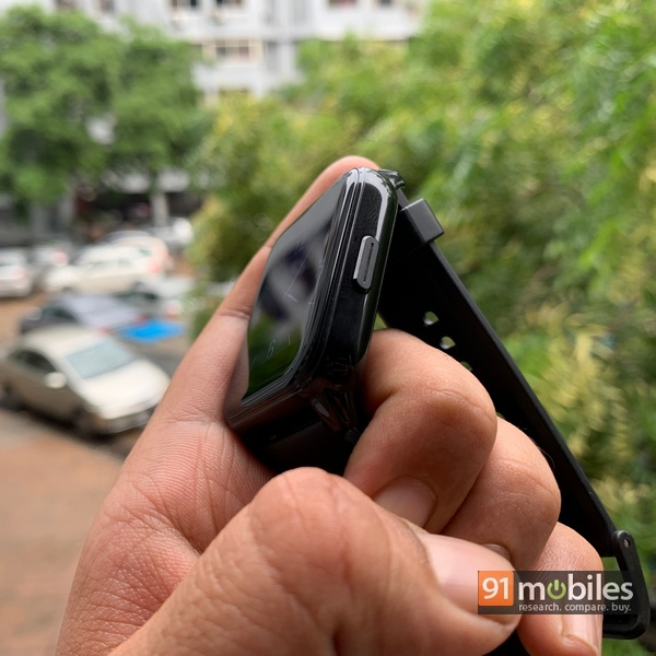 - In terms of the overall design, the Watch 2 has the same display size as the previous Realme Watch at 1.4-inches, though the absence of Realme’s logo on the bottom gives a perception of more screen real estate. Even so, there are substantial bezels around the display which do look a bit unsightly. The plastic build is doesn’t feel cheap but doesn’t exude much premium-ness either. Resolution-wise, the square screen is 320×320 pixels with an LCD panel being used like last time. There is just one button on the side that is used to wake up the watch screen, while several sensors are placed on the back for heart rate monitoring, measuring SpO2 levels, charging and more.
