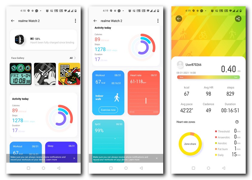 - The UI running on the Watch 2 is the same as last time and quite easy for the user to follow. Swipes in each direction from the home screen bring up different menus. An upward swipe brings up the list of pre-installed apps on the device while a downward one will bring in your notifications. A right swipe brings in quick settings while swiping left continuously shows tiles for calories burnt, weather, heart rate, and more. Watch faces can be changed from the set of defaults ones on the device. A more comprehensive menu is present in the Realme Link app on your smartphone which has to be paired when you boot up the Watch 2. I faced a few issues with the raise to wake functionality since I had to nearly always press the button to wake the device. That said, the general performance of the Watch 2 did feel quite snappy to me with no noticeable lag in any aspect of the user experience.
