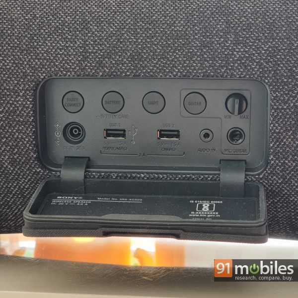 Moving on, the Sony SRS-XG500 is quite rugged too. In fact, the speaker is IP66 certified, so you can use it by a poolside and even spray it with water to rinse it clean. Rest assured, the unit is built like a tank and will keep your mind at ease if you’re entertaining clumsy guests. As for the I/O, the Sony SRS-XG500 ships with a slurry of ports towards the back that have been carefully tucked underneath a rubberised gasket. As such, the device features two Type-A ports that can charge your paired devices as well as a jack to connect a guitar to the speaker and use it as an amp. You can even use the ¼” connector for karaoke sessions by plugging in a mic. Lastly, the device features a barrel-style connector for charging along with a host of buttons that can help you turn the RGB LEDs off and on, switch between a guitar and a mic configuration, etc.