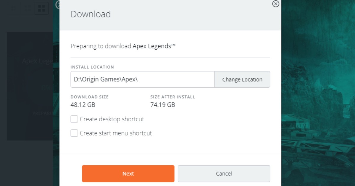 - Pick the download location and hit ‘Next’ to begin downloading Apex Legends.