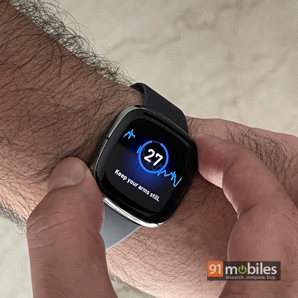 One of the most standout features, as far as I’m concerned, is ECG. Of course, it’s a feature that the Apple Watch is known for, but to my knowledge, there’s no smartwatch for Android users that offers this. There’s the Samsung Galaxy Watch4 and Watch4 Classic that do have this feature listed in their repertoire, but unfortunately, it’s not available for use in India yet. ECG I think, can be a very useful, and potentially life-saving feature. To measure ECG using the Sense, all you need to do is tap on the heart icon in its menu and then hold your index finger and thumb on the top right and bottom left corners of the Sense’s metal frame respectively. Stay still for 30 seconds, and your ECG readings are done.