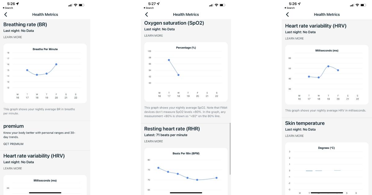 The Sense also features SpO2, but unlike most other wearables, the Sense can’t give you your blood saturation levels on demand. The device tracks SpO2 levels as you sleep, and displays the data in the app. It even logs your skin temperature at night, and once you start wearing it to bed regularly, the app will start showing you trends of how your skin temperature fluctuates over time. There are female health monitoring features as well, built-in GPS to track outdoor walks and runs, support for a wide variety of different sports activities, and water resistance for up to 50m. The Sense can even auto-detect a few common exercises. Some advanced features are available to those who’ve subscribed to Fitbit Premium. Thankfully, six months’ worth of Premium is bundled with the Sense.