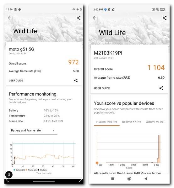 Since Antutu could not turn up with graphic metrics on both the devices, let’s turn towards the services of 3DMark’s Wild Life test. The synthetic benchmark runs a simulation on the device and returns an fps count. The Snapdragon 480+ makes use of the Adreno 619 GPU which has slightly higher compute strength as compared to the Mali-G57 MC2 although the latter does spin at a higher 950MHz. The Moto G51 gets an overall score of 972 while the POCO M3 Pro is slightly higher at 1,104.