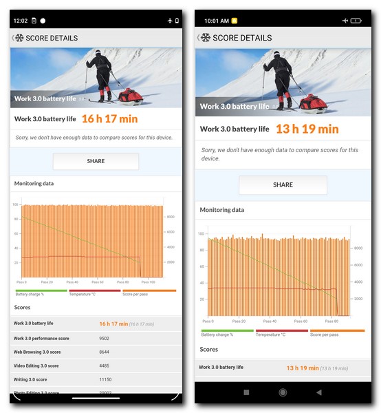 PCMark’s continuously looped daily workflow test returns a score that is a measure of time it takes to drop the battery from 100 percent to 20 percent. The Moto G51, with its 5,000mAh battery, gets a score of 16 hours and 17 minutes while the POCO M3 Pro, which also benefits from the same capacity battery, has a score of just 13 hours and 19 minutes.