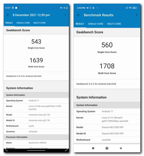 Let’s first start with the most common of benchmarks for CPU testing which is Geekbench 5. On the Moto G51, the single-core and multi-core scores are 543 and 1,639 respectively. On the POCO M3 Pro, those numbers are 560 and 1,708. You can see a marginal improvement in the latter but the difference in real-world performance would likely be negligible. The Snapdragon 480+ platform runs on two performance Kryo 460 Gold cores clocked at 2.2GHz and six efficiency Kryo 460 Silver cores spinning at 1.8GHz. On the Dimensity 700, the story is similar with two Cortex A76 performance cores at 2.2GHz but the six Cortex A55 cores spin slightly faster at 2.0GHz.