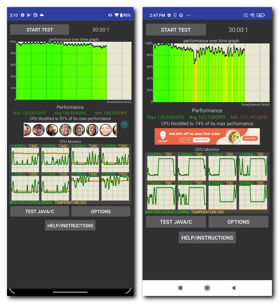 It is also important to know how good a smartphone’s performance is under sustained load. The CPU Throttle test stresses out the phone continuously for a period of 30 minutes. The results were interesting as the Moto G51 was able to maintain a minimum of 90 percent of its processing capabilities for the duration of this test. However, the POCO M3 Pro at one point dropped to nearly 60 percent and had a very erratic performance graph after that. The G51’s processor was running slightly hot at 52 degrees celsius as compared to 50 degrees on the POCO M3 Pro.