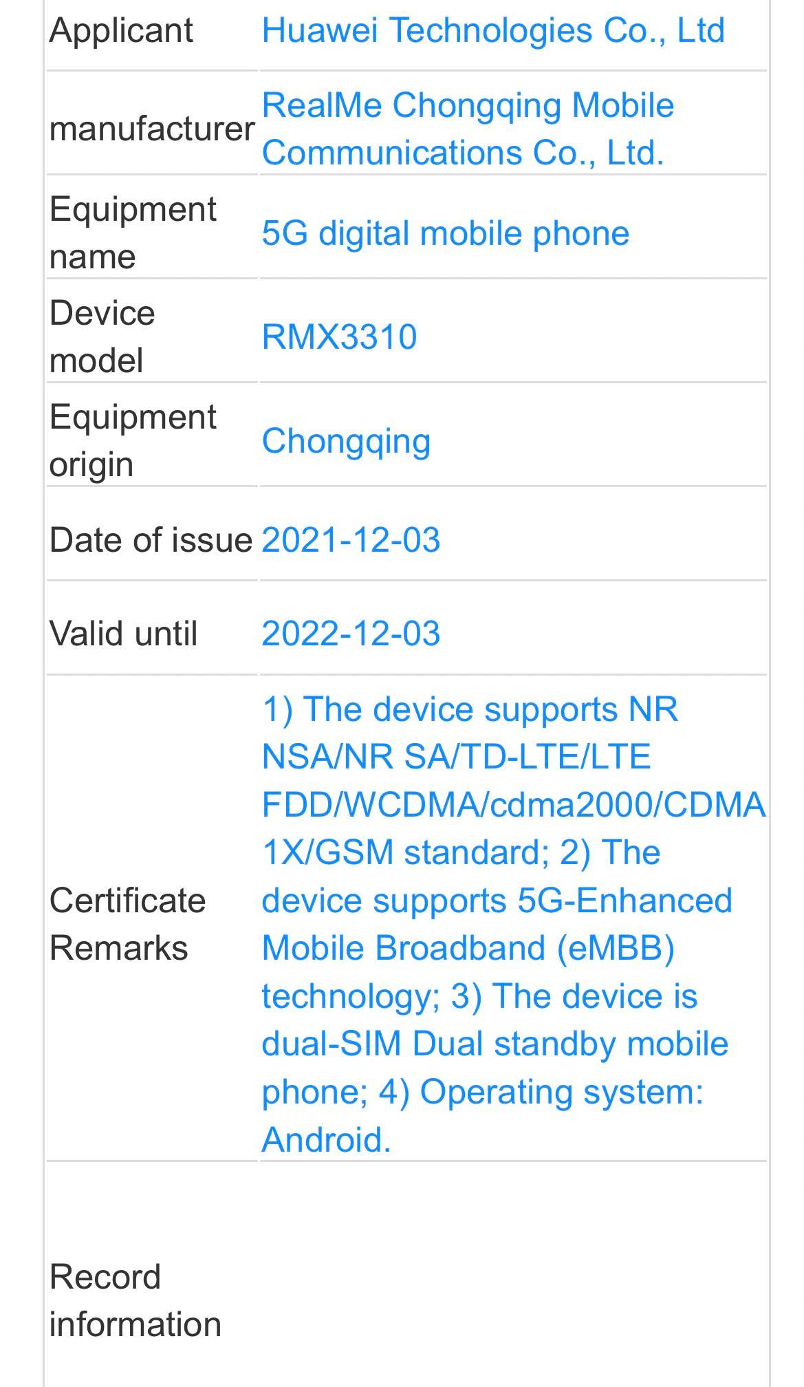 Realme RMX3310 visits TENAA