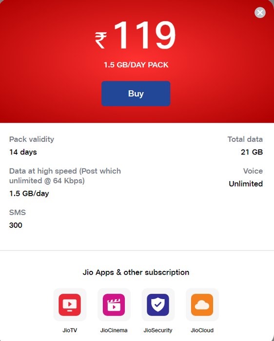 Jio’s Rs 119 prepaid plan offers 1.5GB of data per day, unlimited voice calls to any network, 300 SMS, and 14-day validity. The plan brings access to Jio suite of apps, including Jio Cinema, Jio TV, Jio Security, and Jio Cloud. Post the 1.5GB/day allotted data, the speed will come down to 64kbps. With this move, the Rs 119 plan becomes the most affordable pack to offer SMS benefits and 21GB of total data.