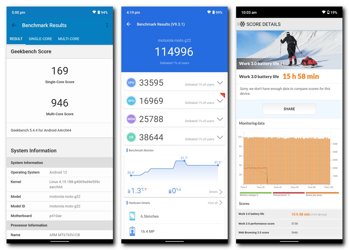 - The Moto G22 is the first device to come with MediaTek’s Helio G37 SoC but in terms of raw performance I think it’s less than impressive. Switching between a few heavy apps is almost always jittery while navigating through the UI or just browsing the Facebook feed tends to bog down the refresh rate. There is only a single variant with 4GB RAM and 64GB internal storage with the external microSD card offering additional storage up to 1TB. Gaming is not the device’s forte and as an example, BGMI can only operate at Balanced graphics settings with frame rate locked at a maximum of 30fps.
