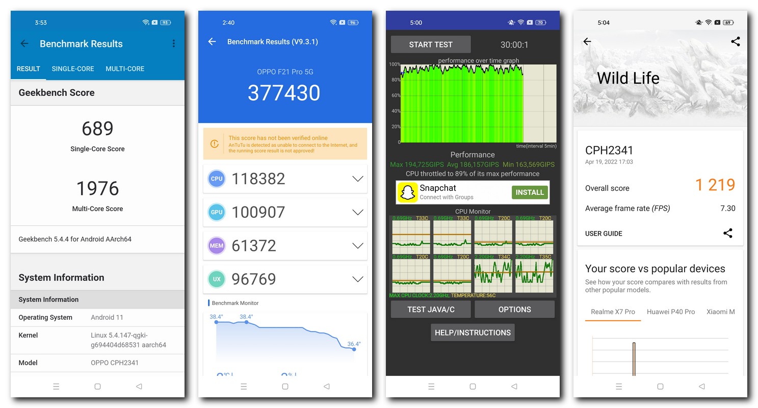 - The Qualcomm Snapdragon 698 SoC is running things on the OPPO F21 Pro 5G and I have to say that I expected something along the lines of the 7 series. Performance is pretty average considering what some other phones are packing under the hood within the same price range. In terms of benchmark scores, the F21 Pro 5G gets an Antutu overall result of 377,430 while Geekbench 5’s multi-core score is 1,976. Neither score is top-notch but if you are planning to get by your daily workload, which doesn’t involve heavy GPU usage, you should be more than fine. In terms of BGMI, the device can manage a maximum of HD graphics and Ultra frame rate although for the latter to function the former has to be set at Smooth. RAM and storage options include a single 8GB + 128GB variant with expandable virtual RAM up to 5GB.