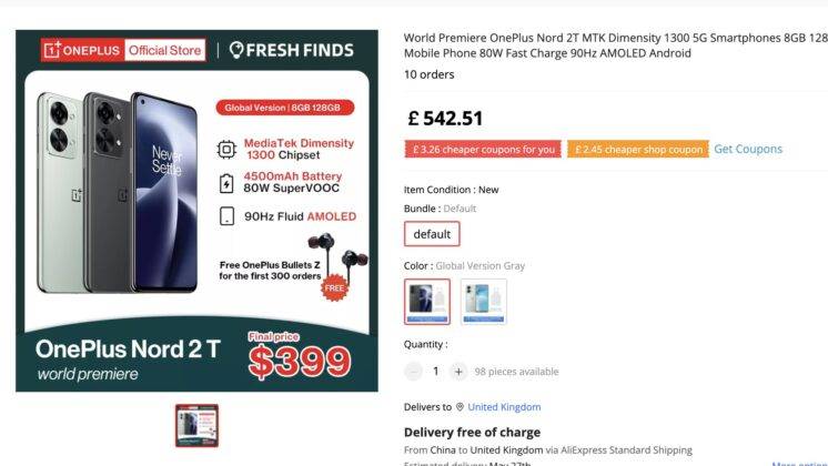 As seen in the images above, this is what the OnePlus Nord 2T 5G will seemingly look like. The device will launch in Green and Black colour schemes. Furthermore, the AliExpress listing suggests that the OnePlus Nord 2T 5G will feature a 6.43-inch FHD+ Liquid AMOLED display with a 90Hz refresh rate. Powering the OnePlus Nord 2T 5G will be a MediaTek Dimensity 1300 processor, which will be paired with 8GB RAM and 128GB internal storage. We can, however, expect the OnePlus Nord 2T 5G to launch in more memory configurations as well.