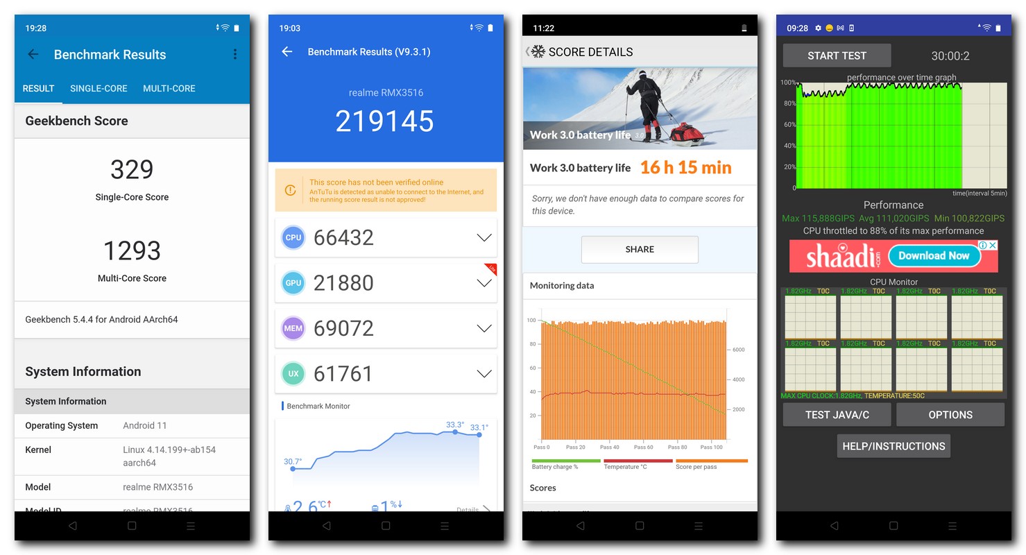 - As for the speaker setup at the bottom of the device, it is nothing great and the headphone jack provides little solace. The fingerprint sensor does have fast authentication speeds and the phone works reliably on the Jio network in Noida. In terms of software, a stripped-down version of the Realme UI, called R Edition, is running on the device. It works quite similarly to Android Go in that it removes excess apps that clog the performance and, in turn, provides a much cleaner UI. You can read about it here in my Realme C35 review. The device has a 5,000mAh battery that can charge at 18W. It can easily last the entire day on normal usage and on PCMark’s Battery test the phone got a healthy score of 16 hours 15 minutes. However, Realme has not provided a charger with the box.