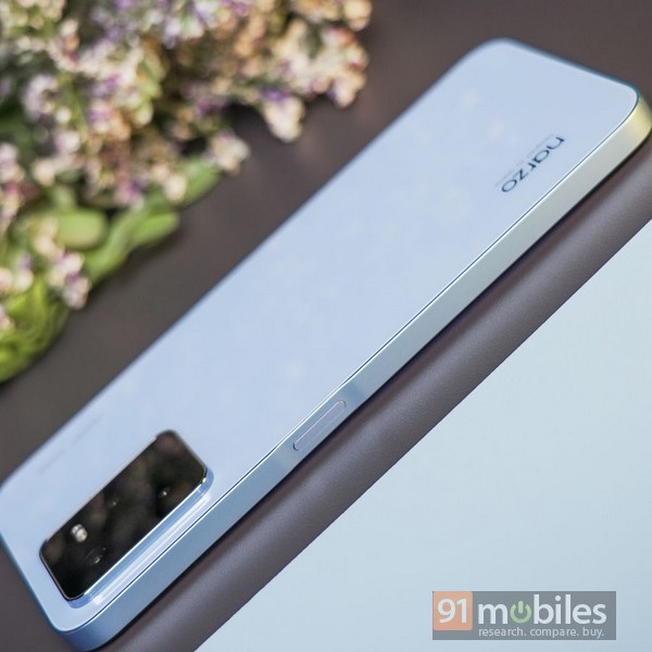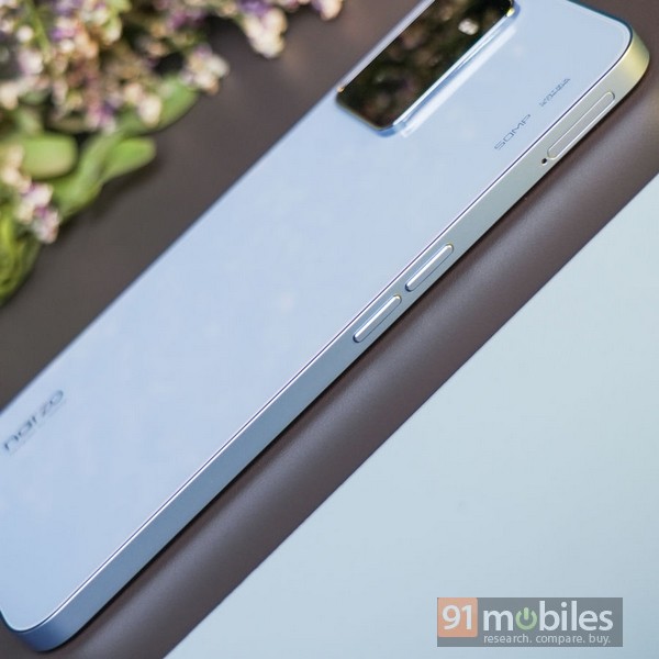 - In terms of design, the Narzo 50A Prime tries to replicate a glass-like finish from its polycarbonate construction. It does look more premium than quite a few budget phones but just as a personal choice, I would’ve loved a matte finish more. The phone has a boxy design with sharp corners that jut into your palms. In general, the Narzo 50A Prime is a bit heavy and also thick, making it less than ideal to carry around in a jeans pocket. The camera housing is slightly raised from the chassis, the fingerprint sensor is integrated with the power button and on the bottom, there is a headphone jack and speaker unit along with a USB C port.