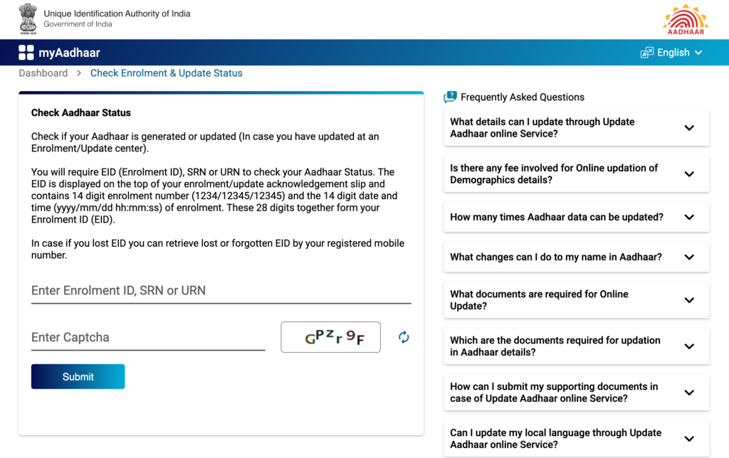 Once you’re done with the enrolment process, you can check your new Aadhaar Card status online via the UIDAI website. All you need is the 14-digit enrolment number or Enrolment ID (EID) found on top of the acknowledgement slip received after the application process. The EID has two parts – a 14-digit enrolment number in the format 1234/1234/12345 and a 14-digit date and time of enrolment in the format yyyy/mm/dd hh:mm:ss. The first 14 digits of the EID are mandatory for checking the Aadhaar status; the date/time part is optional.