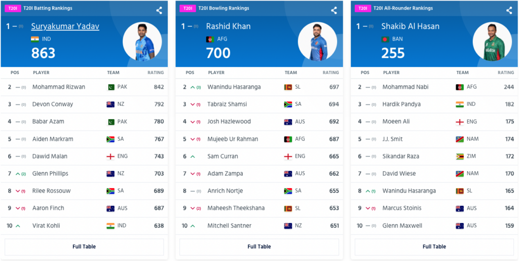 India’s Suryakumar Yadav holds the first position in the T20I batting rankings, while Afghanistan’s Rashid Khan leads the bowling rankings. The number 1 T20I all-rounder is Shakib Al-Hasan from Bangladesh.